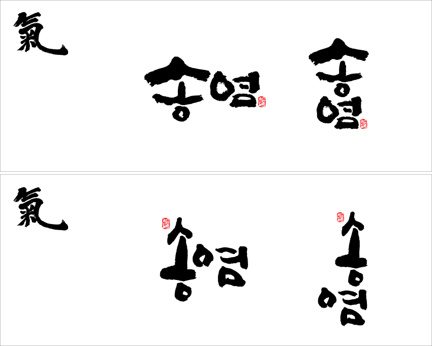 ★ 캘리좀 부탁드립니다. ★ 박현명 일반 2 8821 2010.08.19 14:57 -0001.11.30 00:00 송염.ai (0byte) + 33 하루지났는데도 아무도 안올리길래 눈치봐서 올려봅니다 ㅋ 제꺼 쓰면서 같이 써봤네요. 레이아웃을 같이해야되는지 따로해야되는지 몰라서... 따로따로 써서 올립니다. 알아서 조합하시길...